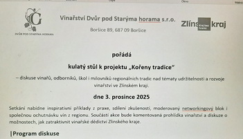 Dvůr pod Starýma horama Bannery Privítanie hostiteľom p. Petrom Gottwaldom Histórie a východiská pre dnešok O daniach a vinároch, perspektíva konzumentov Cistercianska história kraja. Záber na diskutujúcich Spolupráca so ZUŠ Morava v Zlíne v prospech veci Pohľad do bohatých dejín lokality. Zápisy starých nôt, použiteľné pre súčasnosť. Pohľad do areálu.