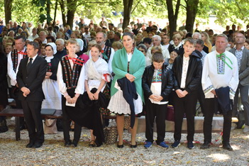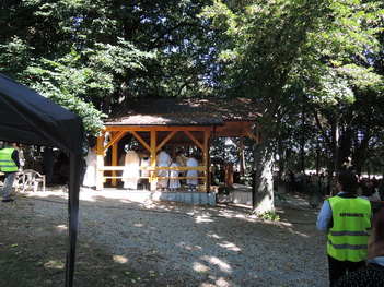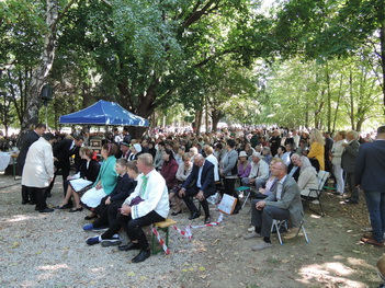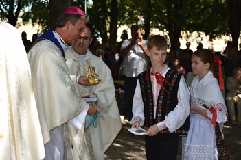 Púť na Studničke v Novej Vsi nad Žitavou. Veriaci v krojoch sledujú sv. omšu. Odovzdávanie darov biskupovi. Omša pod holým nebom prilákala množstvo ľudí. Chýbala perfektná kázeň Vdp. Gála.